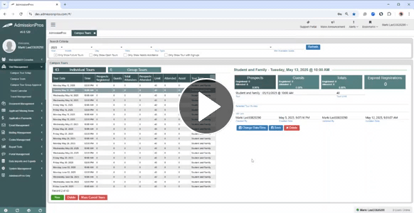 Campus tours can be managed seamlessly in AdmissionPros. Please view the resources below for assistance.