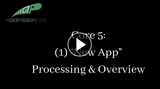 General application processing revolves around five core functions. Each video resource below breaks down one of these essential steps to guide you through the process. The core five functions are: (1) New App (2) GPA Entry, (3) Calc GPA, (4) Documents to Index, and (5) Documents to Link.